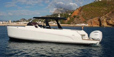 Stunning day/overnight boat. 2 doubles in modern, bright cabin. Full walk around model, centre console, with fixed "T" top. Amazing helm position and superb sea keeping. Bow seating, forward and aft sunbeds, main cockpit galley powered by two 300hp Mercury Verados. Comes with factory warranty. Lying in Denia.